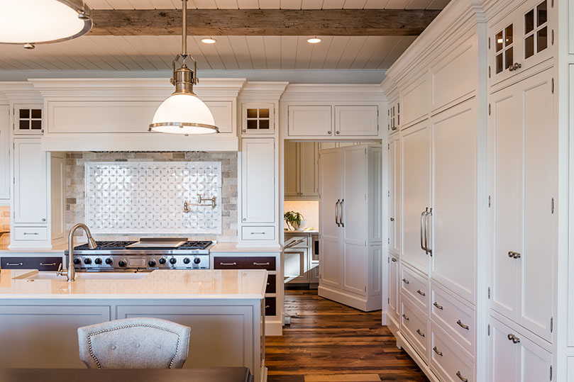 This waterfront cottage features barnwood floors, Subzero/Wolf appliances, inset wood cabinets with accent inlays in walnut, marble countertops and a mosaic splash by New Ravenna. The jib door was outfitted as a cabinet to hide the pantry area, which worked as a secondary prep area to the main kitchen. Photography by Jason Miller.