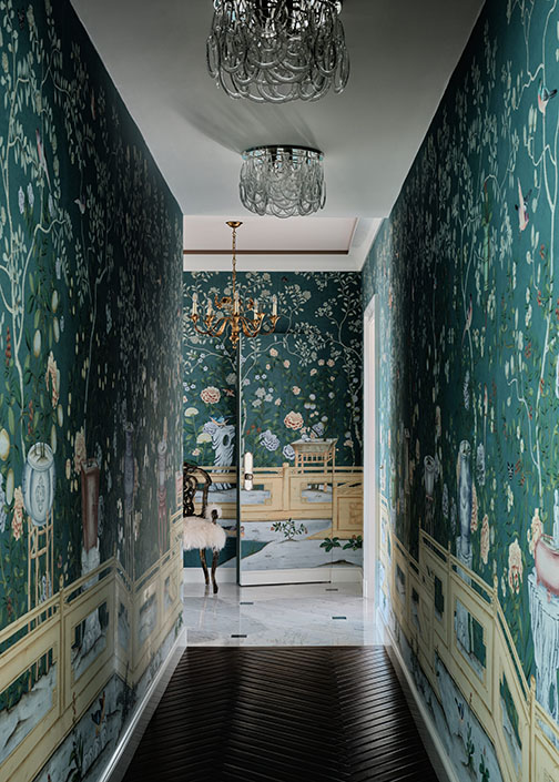 A jib door was added to this space so as not to interrupt this magnificent de Gournay wallpaper. The small bling door hardware was added so the clients didn’t get lost in this beautiful Garden of Eden. Photography by Reed McKendree.