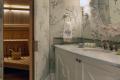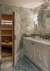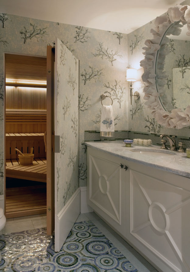 This jib door is a hidden entry to a sauna space at Martha’s Vineyard. Covering the door keeps your eye wandering around the room and exploring all the beautiful elements. Imagine the surprise when guests discover what’s behind it! Photography by Eric Roth.