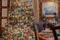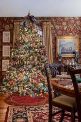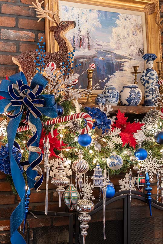 Several of those ornaments are placed on the family room tree, which holds all the ornaments that aren’t glass. Teddy adds glam and color with sparkly ribbon and shots of blues and plaids. “I’m a big fan of blue and white and the garland in the family room has taken that theme with red added into it,” says Teddy. “One year at the store we had a lot of blue and white ornaments, so I bought several. I also have a lot of blue and white jars and figurines.” Those are grouped on the family room fireplace along with glittery blue bows and Lennox snowflake ornaments. Poinsettia blooms add pops of red.