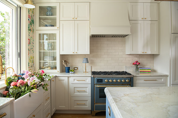 This newly remodeled kitchen blends timeless craftsmanship with breezy indoor–outdoor living. At its heart is a classic farmhouse sink set beneath a retractable window and a statement French-inspired range in a blue gray, accented with gleaming brass, that anchors the room with refined presence. The result is a kitchen that feels equally suited for everyday family life and effortless entertaining: classic, inviting and beautifully attuned to its surroundings. Photography by Laura Visioni.