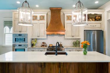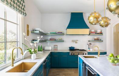 After a fire wiped out the client’s beloved French-inspired kitchen, the designers brought it back in vivid color as a peacock-blue and brass paradise, topped with five gobstopper-style pendants. From the shimmering bistro tile climbing counter to ceiling, and the brass-trimmed custom open shelves and vent hood, to the gleaming gold sinks, every detail was designed to bring joy, with a little French inspiration, back from the ashes!