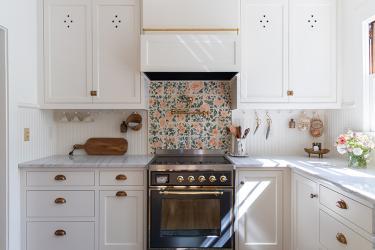 Wise Design helped transform a 100-square-foot kitchen from its 1960s renovation to a period appropriate design with modern conveniences. Changes included a new opening from the dining room to the kitchen as well as a stunning handmade tile (inspired by an AI-generated image for a life imitating art moment) by Tempest Tileworks. Custom cabinetry including vent holes, paneling for appliances, beadboard and peg rails by George Ramos Woodworking. Photography by Seppi Reda.
