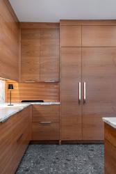 Located in St. Louis’s historic Shaw neighborhood, this “Shaw Chic” kitchen is a seamless blend of modern luxury and everyday functionality. Custom cherry cabinetry, meticulously grain-matched in a horizontal direction, creates warmth and visual continuity. Full-slab Italian Calacatta Paonazzo marble defines the countertops and backsplash, with the island crafted as a butterfly match of two slabs. Other thoughtful details include terrazzo-inspired heated floors, a marble-topped shoe bench at the back door, and a full-height cherry bookshelf to hold cookbooks. This thoughtfully crafted space that elevates cooking, gathering and everyday living with refined design, advanced technology and timeless materials.