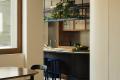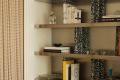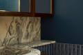 Another highlight—the built-in shelving design—makes its own statement about the unity of the home’s history and transformation. Art Deco-inspired shapes and colors harmonize with raw aluminum and dark terrazzo, creating a storage space that is both functional and appealing. Such a design is made to store and display memories, history and representation of both new and old.