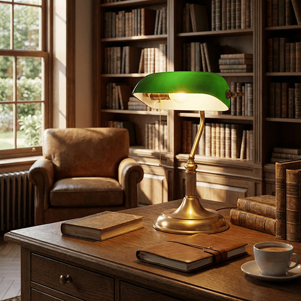 The classic Banker’s lamp, often seen in movies and TV shows, originally became popular during the Art Deco period and is highly associated with the style due to the use of similar materials and sleek, yet colorful design concept. Shelburne House of Troy Banker table lamp in polished brass, available at Metro Lighting. Photography courtesy of Vakker Light.