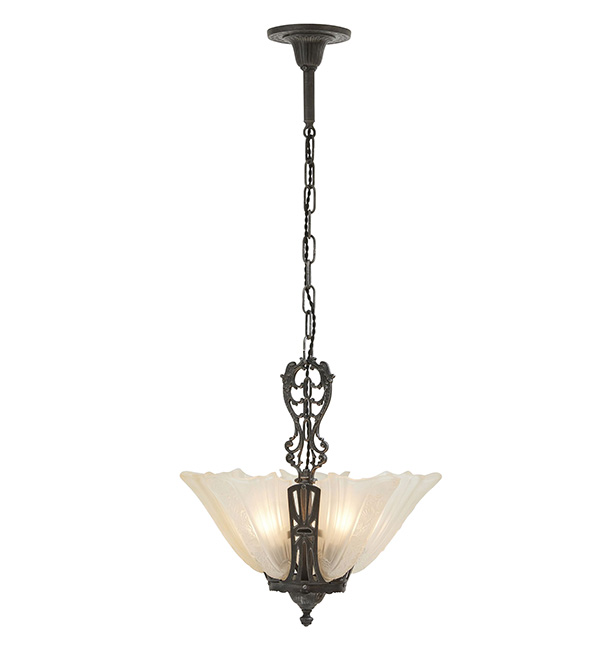 Slipper or Slip shades were common among chandeliers and pendants and featured a curved milk glass shade that produced soft light. Vintage Art Deco chandelier slipper shade, available at Rejuvination.