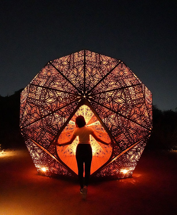 Starting April 10, visitors of the Missouri Botanical Garden can witness the geometric and glowing art of HYBYCOZO, a unique artistic duo highlighting the intricate patterns of nature through awe-inspiring, intricately designed sculptures. Throughout the spring and summer, the Garden offers both daytime viewing and special illuminated evening hours to explore its newest art exhibition–"Patterns in Nature: The Art of HYBYCOZO."