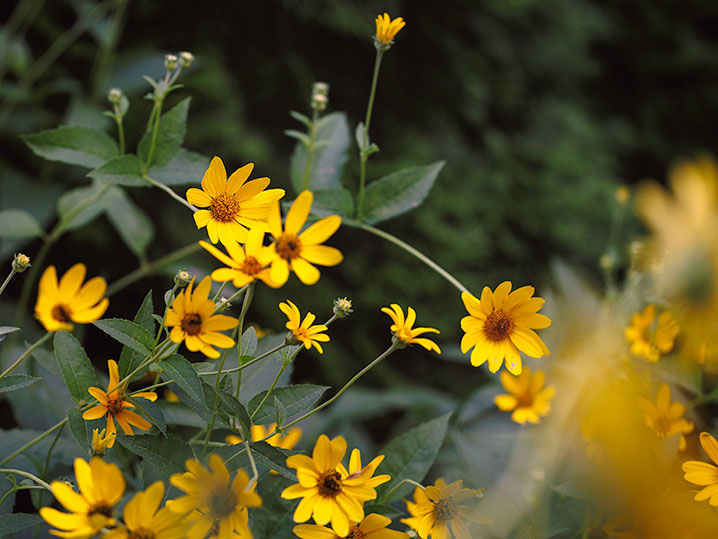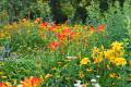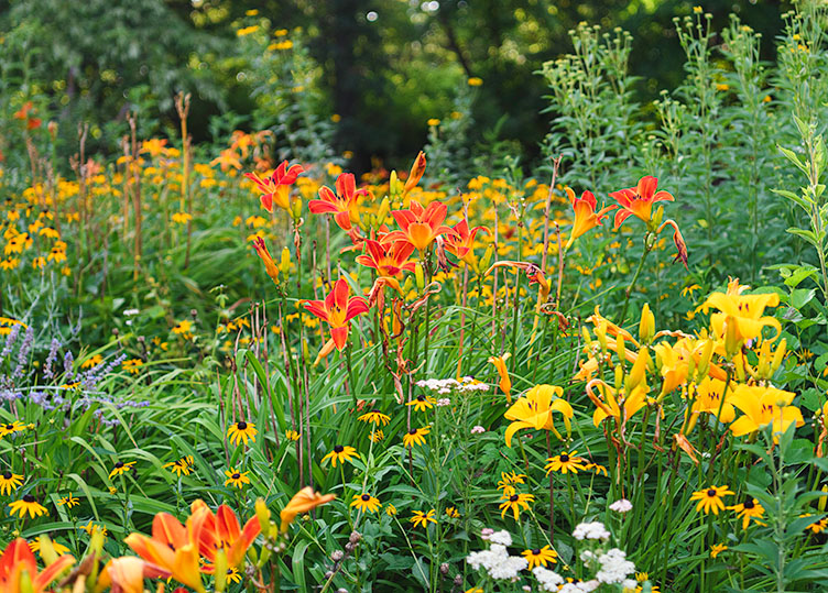 She is surrounded by the rich sunset hues of hundreds of daylilies, mounds of purple and gold created by plantings of different coneflower varieties and scarlet-centered, blush-colored hibiscus blossoms the size of giant saucers. All those vibrant, jewel colors are offset by the sparkling emerald green of approximately 350 lush-leafed hostas.