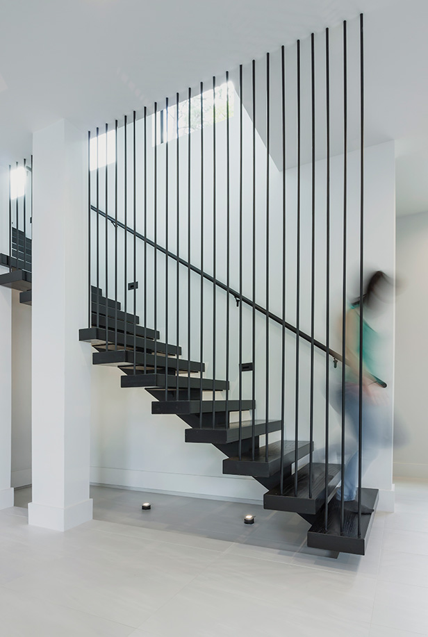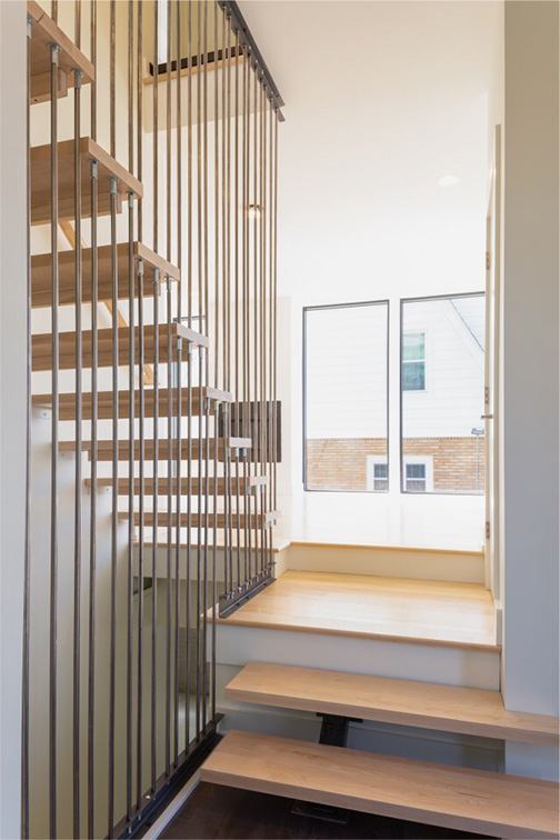 Following an integrated design approach with the architect and client, this custom floating stair system perfectly reflects the home's contemporary multigenerational design. Solid maple treads were engineered to lock into the main wall, while the spacing on the threaded rods was engineered meticulously to meet safety codes without sacrificing the open aesthetic. Photography by Michael Christie Photography.