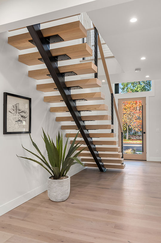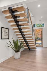 In this particular home, the staircase is the first element you encounter upon entry, making it a central design feature. Baluco chose a floating stair system to preserve openness and allow natural light to flow freely throughout the space. Custom white oak treads and a matching handrail were introduced to soften the contrast of the black steel structure, creating a balanced and inviting aesthetic. Photography by Clarity Northwest.