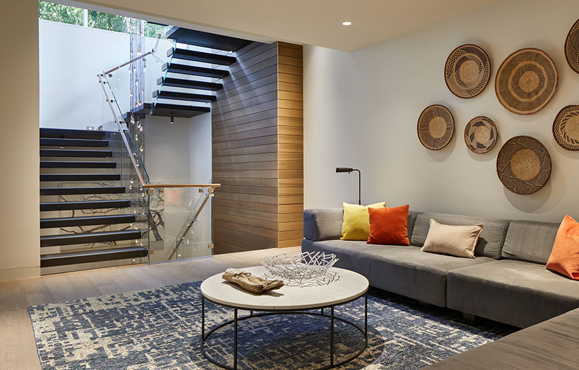 The staircase was custom-designed as a light, sculptural element that feels almost suspended within the space, with clean glass treads that minimize visual weight. The design was driven by a desire to create openness between levels, allowing light to flow freely while maintaining a strong architectural presence. It serves as both a functional connection and a quiet focal point that elevates the entire interior. Photography by Jean Bai.