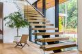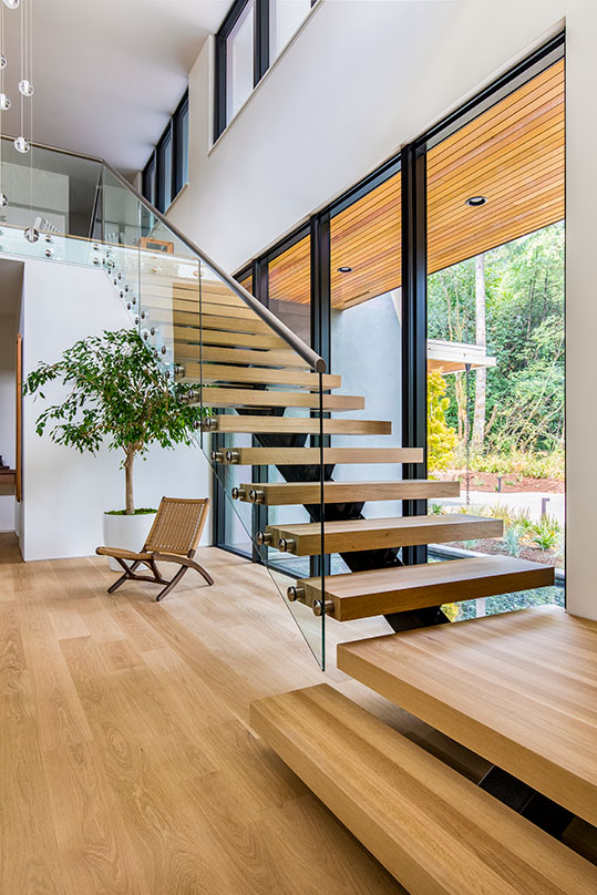 The staircase reads as a sculptural centerpiece, its floating treads and glass guardrails dissolving visual boundaries and inviting light to move effortlessly through the space. Conceived as a vertical continuation of the home’s inside-out ethos, it preserves uninterrupted sightlines while subtly linking the layered interiors to the surrounding landscape. A refined interplay of warm wood, metal and glass lends the composition a quiet elegance—both contemporary and deeply connected to nature. Photography by Benjamin Benschneider.