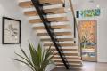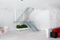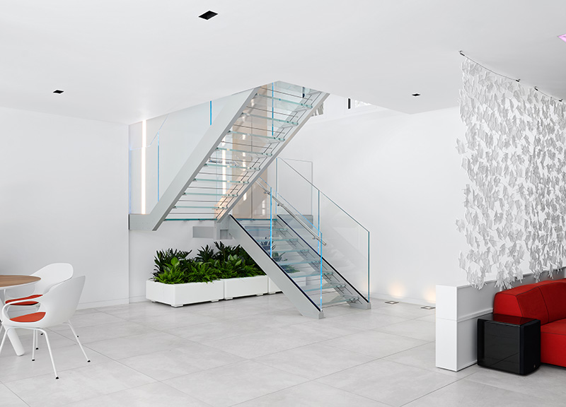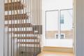 This stairwell needed to be almost transparent and allow light into the living area as well as being a simple, sculptural structure. Specific materials were chosen to be seamless with the warm white oak floors and glass walls on both sides of the living areas. Photography by David Papazian.