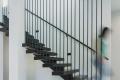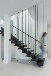 This staircase features 4” thick, oversized box treads with a deep charcoal or blackened oak finish mounted to a steel mono stringer, creating a "floating" effect that emphasizes the structural purity of each step. These continuous slim profiles create a "cage" effect that provides safety without obstructing sightlines or the flow of natural light from the skylight above. Photography by Justin Palazzo.