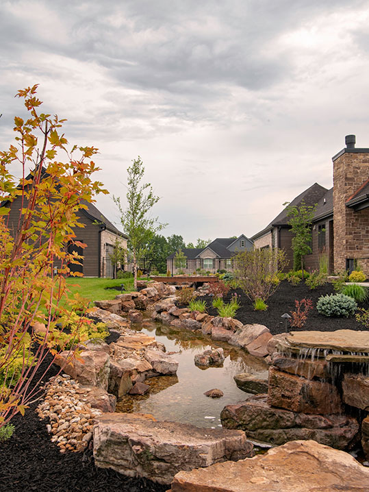The stone-lined creek cascades from the top of the patio just off the house and runs slightly downhill past the pool and culminates in a small pond accented with a stacked-stone, 360-degree pedestal waterfall. A wooden foot bridge spans the stream and connects the upper patio with the yard beyond.