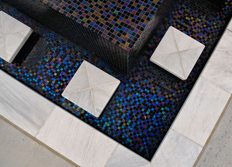 The geometric design of the pool was the key piece of the landscaping puzzle and Don Kuhn was delighted to “get a green light” on some special features to incorporate into the pool and surround. Those include a 360-degree, vanishing edge spa, a swim-up bar area and a shallow tanning ledge. All are faced with multi-colored, jewel-toned mosaic tiles.  The 1,500 square-foot pool’s white marble edging and Black Eclipse PebbleSheen finish dramatically set off the sparkling, gem-like tiles.