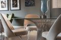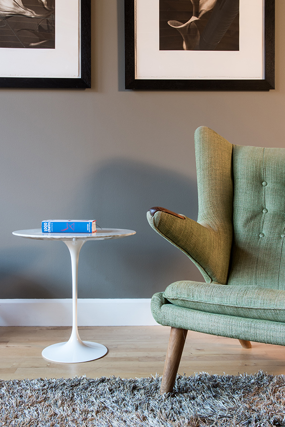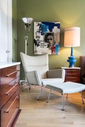 In the “drawing” room area, the wall color transitions to a soft khaki tone, and a Florence Knoll sofa from Herman Miller, glass Barcelona coffee table and hand-knotted Kasthall rug delineate the living room. It’s the skillful arrangement of the owners’ fabulous collection of designer chairs that separates this expansive open space into distinct living and TV rooms, however. A sampling includes a white Saarinen womb chair from MoModerne; a Wegner papa bear chair in soft green from Rocket Century; two Le Corbusier leather chairs from Centro flanking a Milo Baughman table; a vintage plycraft Mr. chair; an airplane chair from Design Within Reach; a black Milo Baughman leather chair from TFA The Future Antiques; and the list goes on…