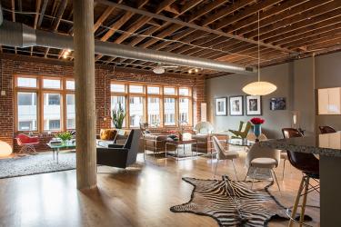 Pleased with the city’s vibrant lifestyle, they made the decision to invest in a home in the downtown area, subject to four basic requirements. It had to be on the top floor, with personal outdoor space, private laundry facilities and indoor parking. Meeting all of their qualifications was a spacious two-bedroom loft occupying half the top floor of the historic Alexander Building. Built in 1906 and listed on the National Register in 2004, the five-story structure was renovated in 2005-07, together with the neighboring Spool Thread Building. Once a major national supplier, Spool Thread manufactured the cotton and silk thread used in the Washington Avenue garment district.