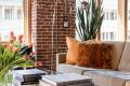 The master bedroom’s open-beamed ceiling rises to approximately 18 feet and, reinforcing the loft’s industrial ambience, an exposed metal beam calls attention to the patio doors accessing the balcony. Wood panels line the wall behind the walnut bed from West Elm; rustic chests from Jules Pass have been repurposed as nightstands; and at the foot of the bed is a George Nelson bench. Throw rugs – one a woven Indian piece, the other freeform and plush – add color and texture to the gleaming wood floor.