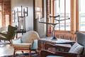 Random floor orbs provide subtle lighting for both spaces and, illustrating the owners’ sense of humor, a colorful “ottoman” made of shredded flip-flops and a red Mezzadro stool by Archille Castiglioni lend a fanciful touch. “Justin grew up on a farm, and the stool reminds him of a tractor seat,” Greg laughs. Serious again, he mentions that one of the unique aspects of their collection is that many of the chairs include ottomans, something of a rarity with Mid-century designs.