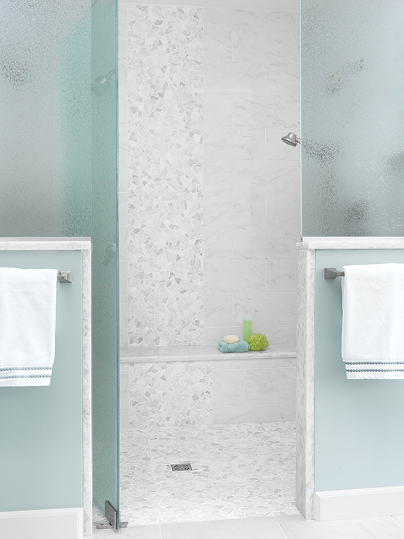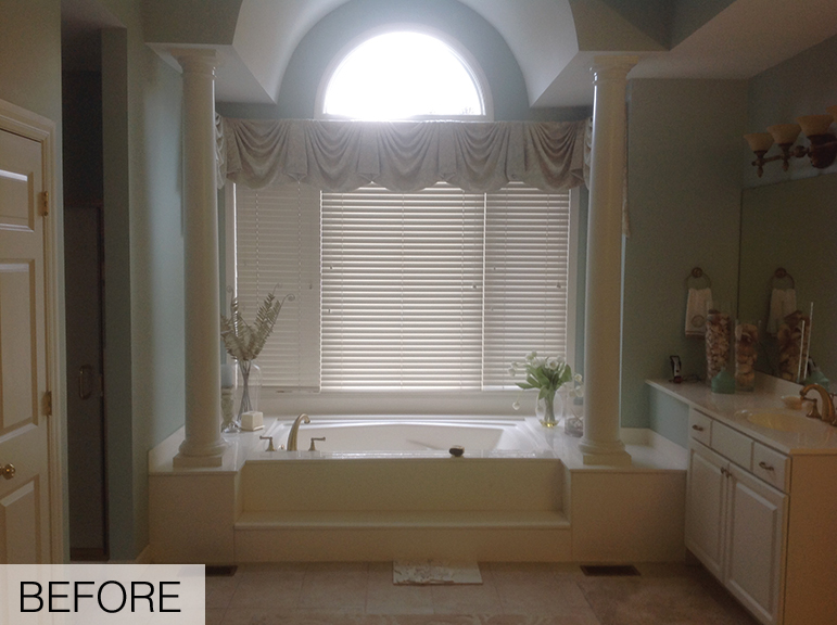 To the husband and wife, the master bathroom in their Town and Country home was uninspired and sometimes even unfriendly, lacking privacy and functionality for them, their four children and occasional visitors. It’s a large space, but it had no enclosure for the toilet. Two tub-side columns, while attractive, blocked a beautiful outdoor view and made the room feel close. And the overall design didn’t address potential changes in mobility.