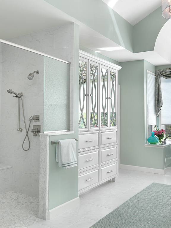 Using principles of universal design, Dana reconfigured the space for easier maneuverability, concentrating storage lower on the wall to make it more accessible. Grab bars and handle pulls are in easy reach, and a larger door eases the transition into the room, whether by foot or wheelchair.