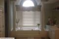 Tom updated the existing blue-green walls and white cabinetry with a pale blue-and-white scheme. A contrasting lime green ottoman adds a pop of warmth in the center of the room. “I love the freshness of the space. It beckons you,” he says. “I love the shower with a focal tile feature running down the center of the back wall and the patterned glass door. The large window is magnificent and treated with a blue fabric that frames the trees and lawns beyond.”