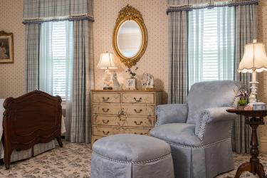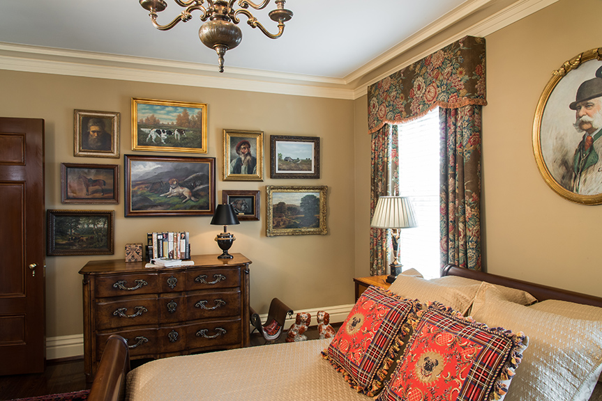 The master bedroom and several guest suites complete the second story. The masculine of the two guest rooms has a classic Ralph Lauren vibe with rich wood finishes and deep color palettes. Dogs also play a prominent role in the throw pillows and artwork. Connected via a Jack-and-Jill bathroom, the second guest room stuns in soft blues and creams. Delicate floral wallpaper, blue plaid drapes and a dusty-blue armchair give the room its feminine characteristics.