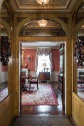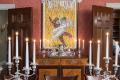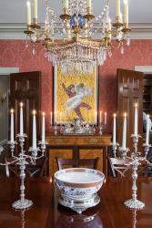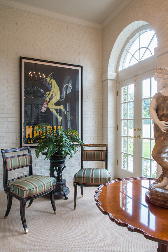 Another Cappiello piece is displayed prominently in the dining room and is one of the homeowner’s favorites, “Theatre National de ‘opéra.” The vibrant yellow contrasts against the Schumacher damask wallpaper. The crown molding in the room is original to the home but the homeowners added the wainscoting panels and ceiling medallion from which a beautiful, gilded crystal chandelier with sapphire sphere hangs. A John Widdicomb dining table with gold leaf accents seats eight in the kindel chairs covered in mohair . Much of the furnishings in the home are of the Regency and Georgian period, so they easily pair together in a space.
