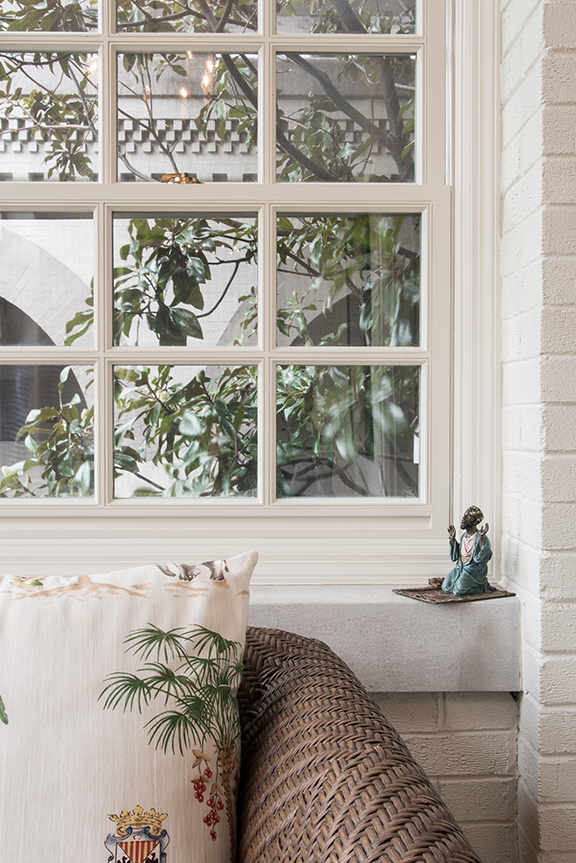 Tucked off the side of the living room, the sunroom is awash in natural light. A set of French doors opens directly to the back patio. “We love to open the doors and sit in there during a rain storm,” he says. The homeowners painted the original brick white, which really brightens the room.