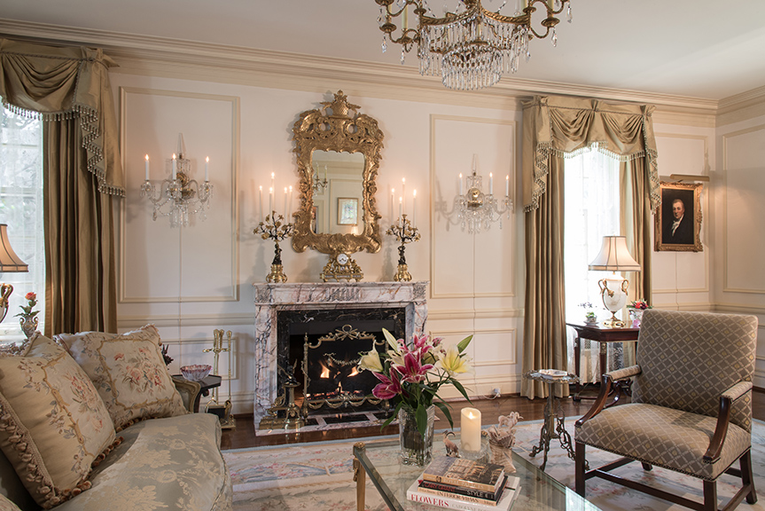 The formal living room sets the tone for the grandeur and formality in the home. An antique Louis XV sofa covered in an elegant silk damask with tapestry petit point pillows sets up a proper seating area when paired with two antique English George III chairs circa 1770. All are centered on the cozy, gas-burning fireplace with the original marble mantel. At the suggestion of her mother, the homeowners added the picture-frame molding to the walls, which harmonizes with the style of the home and furnishings.