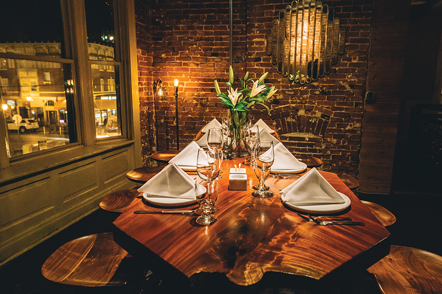 Signature monolithic pieces were commissioned by owner Kevin Brennan from Martin Goebel, Goebel & Co. Furniture, in order to fully elevate the unique experience. The street seating is adorned with timber framed White oak tables. A single-plank Mexican Mahogany community table anchors the second-floor bar. Pedestal stools with hand-carved seats reminiscent of antique tractor seats encircle the mahogany slab. Co-working and private event space next door dubbed “The B-Hive” is furnished with nearly 30 of Goebel’s signature pieces as well as a custom bar top with wood sourced from local tornado-downed trees.