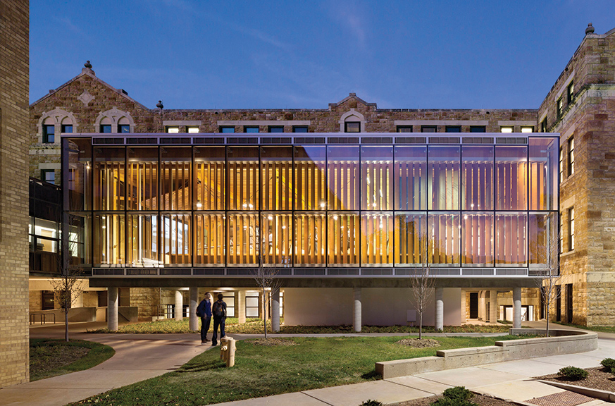The Forum was conceived in 2004 by John Gaunt, Dean of the University of Kansas School of Architecture, Design & Planning from 1995 to 2015. The addition to Marvin Hall would be the first since the building was built in 1907. Built to address the school’s need for a central commons space and auditorium within its own building, The Forum was completed in 2014, only one year after construction began.