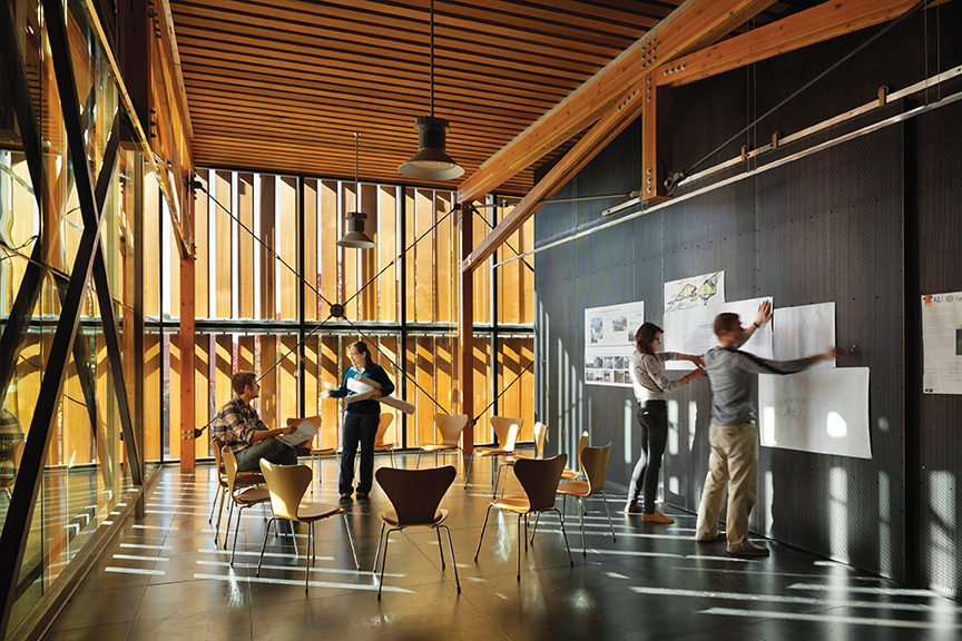 The university made a rare and unprecedented decision to grant permission to the students working for the Department of Architecture’s Studio 804 Design/Build program under the direction of J.L. Constant Distinguished Professor of Architecture Dan Rockhill to construct the Forum. An outdoor workshop was demolished to make room for the new structure, but an existing shed housing the electrical services for Marvin Hall had to remain in operation so the addition was carefully built above the mechanics. A new glass-enclosed 121-seat auditorium, separate breakout jury space for student reviews and presentations and a commons area make up the new Forum building. Sustainable features include solar panels, rain harvesting and a living wall.