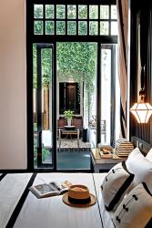 A muted color scheme of black, white, gray, cream and neutrals is combined with natural textures such as wood, weave, leather and stone. The overall setting reflects the period of Bangkok’s greatest grandeur under King Rama V with Art Deco accents. The neighborhood in which the hotel is built is surrounded by heritage buildings more than 100 years old, so the design duo also made sure the hotel design would fit in rather than stand out.