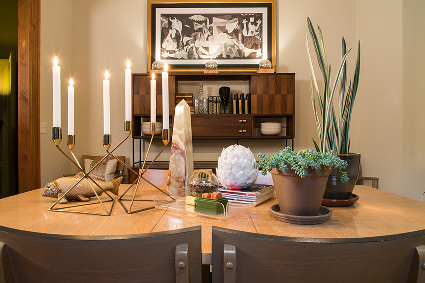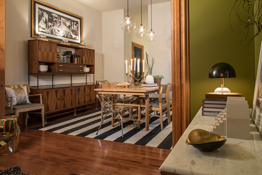 The designers decided to use the same rug in the adjoining dining room to extend the living space making it feel larger. A vintage sideboard and hutch from Cherokee street was a find they knew needed to immediately find a place in their home, and it houses glassware and plates that Mike likes to collect. Mike and Justin were very careful in how they organized the dining room. None of the walls were centered, so it took a conscious effort to hang the three pendant lights over the dining table.