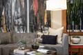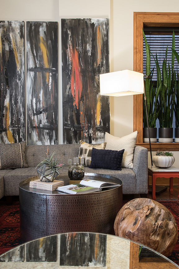 Connected to the dining room through the kitchen, the family room is where Mike and Justin spend the majority of their time, yet they say it is the space they’ve given the least design attention to. “It’s a functional space,” Mike says. The sectional needed to fit as perfectly as it could to optimize seating. The low lines of the back of the sectional line up with the window framing. The designers chose a neutral color scheme for the furnishings to build a more subtle color scheme around the artwork, which is an abstract mix of mustard gold, oranges and reds. Painted by Mike, the artwork is a very personal touch in the space, and Justin says is a nice reminder of their time in the city.