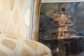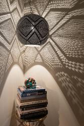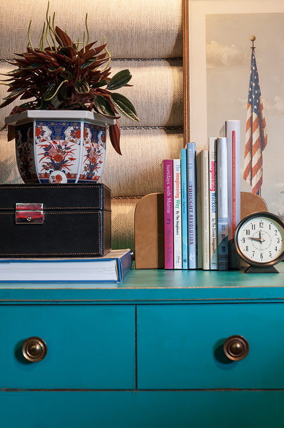 Another space in the home bursting with saturated color is the master bedroom. One of the smallest rooms in the home, Mike and Justin painted the walls and ceiling a navy blue to trick the eye while still having a cozy feel. To offset the deep color on the wall, neutral furnishings and accessories complete the look, including a wall-to-wall upholstered headboard and wood block light fixtures with dangling red cords. The peacock mirror introduces reflections into the space and anchors the wall. “This is one of my favorite rooms in the home,” Mike says. “The color is so saturated during the day and moody at night.”