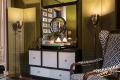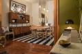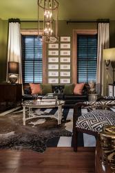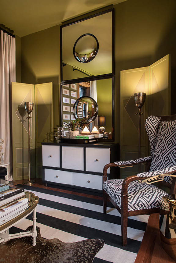 The synchronization of the design elements in each space drove the design decisions. Justin and Mike selected the palette of furniture, rugs, artwork and accessories for each room before deciding on a paint color. In the living room, a bold, dramatic shade of green dominates the walls and ceiling. An unexpected color choice when entering the home, matching the walls to the ceiling gives an interesting effect by turning the focus on lighting, artwork, etc. “The color becomes a really warm envelope for the other pieces to speak more than the walls and ceiling,” Mike explains.
