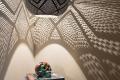 The statement chandelier hanging in the entry… that was a total experiment the designers admit. Originally from the '80s with glass prisms, it was the right shape and size, but the wrong style. They removed the glass, got rid of the shiny brass finish and added the rope detail, making the fixture more modern. Another modern element, the black-and-white bold striped rug was necessary to balance the more traditional elements in the space. With a hide layered on top, the rug is perfect for an entry.