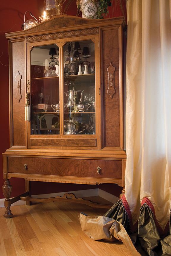 “Although not looking for a dining-room china cabinet, this piece was available in a favorite shop at a very good price point. After stripping away layers of uneven glaze and mottled base coat, what a surprise was revealed! Research shows this walnut piece is reminiscent of heirlooms from the 1920s. A find like this will remain in our family for generations!” Joyce Mathis, MJM Design Company.