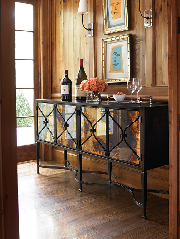 “I love this entertainment console not only for the functional part, but also for the mix of materials. The darker wood blends well with other pieces in my home. The iron legs and detail on the doors works well with light fixtures, and the reflective quality adds elegance. This piece will function well in a dining space, bedroom as well as a media cabinet. Overall, I will be able to move it in various locations to change the look.” Ellen Kurtz, Ellen Kurtz Interiors.