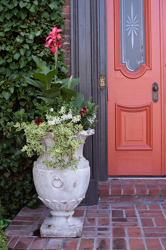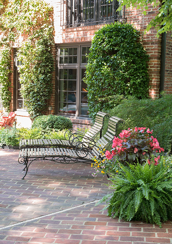 Containers supply much of the color around Debbie’s patio and doorways. “I love cannas,” she says. “They give you such a big pop; so much bang for the buck.” She also has fallen in love with the huge, lance-shaped, variegated leaves of the ginger plant. “I will always have a jar reserved for one; they are stunning.” In areas that don’t get a lot of sun, she loves to enhance ordinary hanging baskets of Boston ferns with battery operated LED twinkle lights.