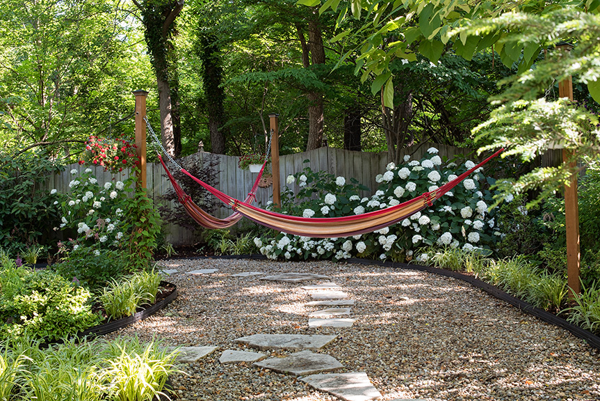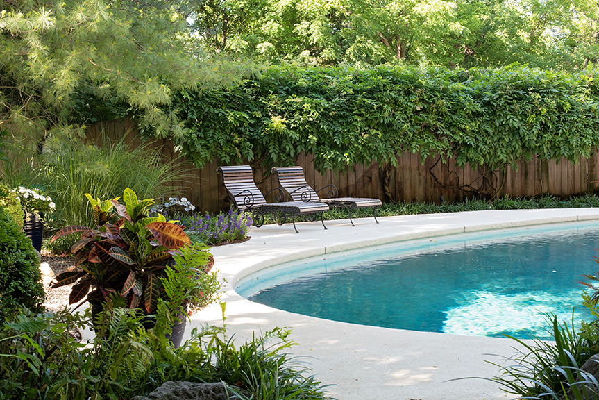 She also wanted to work as much as possible with the existing framework of the garden, which included a swimming pool, dock-like deck next to the pool, brick patio, gravel pathways and large posts anchoring hammocks. What needed to be transformed were the planting beds and the borders surrounding the yard.