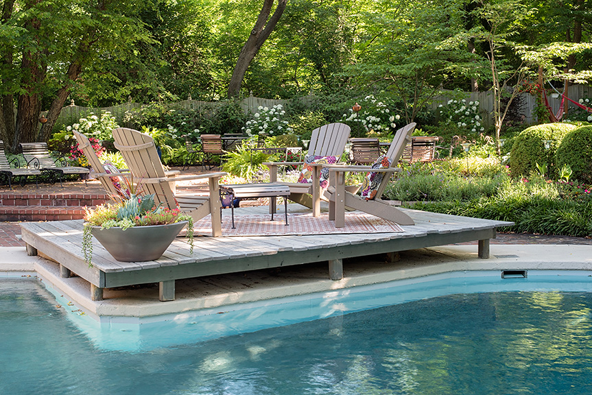 Along the walkways, lirope/monkey grass, epimedium/bishop’s hat, ajuga and hostas provide not just ground cover, but a symphony of different textures and varying colors of green. In one area near the pool, a curve of gray-green lavender cascades over a garden wall. While the landscape includes traditional spring flowering dogwood, Bob suggested to Debbie’s delight a Japanese/Chinese kousa dogwood, which features star-shaped white blossoms against dark-green foliage, and blooms later than native dogwoods. They also recently planted a katsura tree with heart-shaped leaves that change color spring through fall. While none of the plants are hard to grow, the beauty and serenity of the colors and textures gives the garden a rich, elegant appearance.