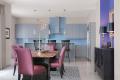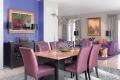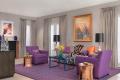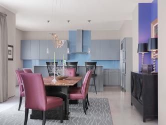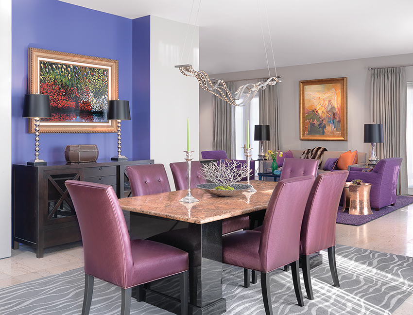 One of the designer’s favorite pieces, a sinuous chrome chandelier draws the eye into the dining area, where a lightly textured area rug repeats the wave motif. Positioned in a blue-purple niche are the owner’s dark-stained sideboard and two sleek lamps with black shades, prompting Manche to mention that “black adds a certain amount of sophistication.” The custom dining table is a terra-cotta granite slab, set on black granite columns to handle the weight, and light-plum chairs introduce the vivid purple tones that dominate the living room’s palette.