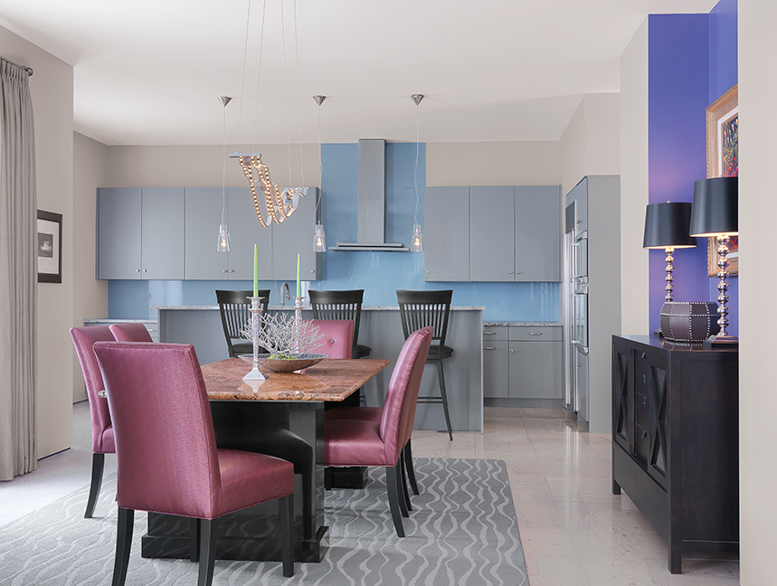 Moving into the activity spaces, Manche’s use of color gradually intensifies, starting in the kitchen, where the streamlined cabinetry is a deeper shade of gray, complemented by granite countertops. A solid piece of soft blue, color-backed glass underscores the gray range hood; the island’s original glass top was replaced with granite; and a sink, dishwasher, wine cooler and microwave and warming drawers were added to make this feature more functional.