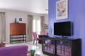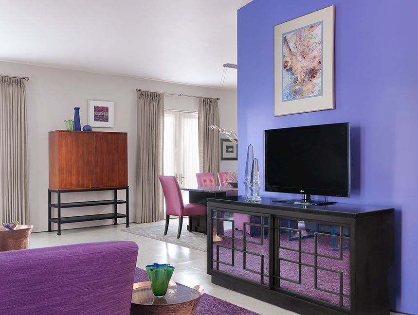 Against a curved blue-purple accent wall, the flat-screen TV rests on a contemporary black media cabinet with mirrored doors in a trellis pattern, and an opening was made in the wall to hide the wiring in an adjacent closet. Above this arrangement is one of three signed, organic watercolors that the designer found in an antique mall, reserving the other two for the bedrooms.