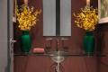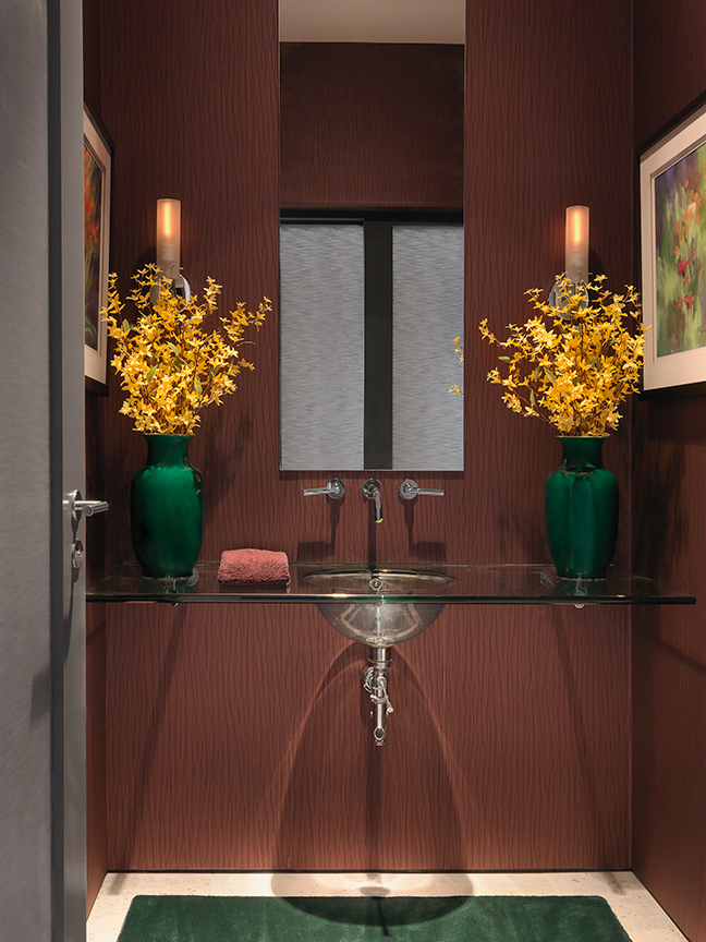Even the hall powder room makes a distinctive statement. Textured, plum-colored wallpaper surrounds a clear glass, wall-mounted sink, with floral artwork, jade green carpeting and Chinese vases filled with forsythia adding natural accents.